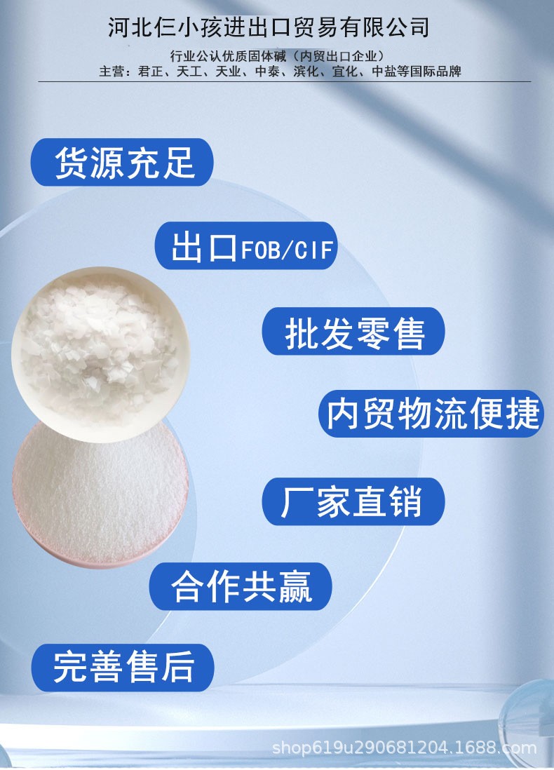 河北仨小孩进出口贸易有限公司,专营 天工片碱 天业片碱 宜化片碱 中泰片碱 君正片碱 中盐片碱 北元片碱 金昱元片碱 滨化片碱 津华片碱 优固邦片碱等业务,有意向的客户请咨询我们,联系电话:13122225095